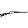 The Henry Repeating Arms Texas Tribute 22 S,L, LR 20" Otg Br 16rd is a stunning homage to the Lone Star State, featuring a 20-inch octagon barrel and a striking combination of blued steel and brasslite finish. This lever-action rifle is adorned with brass stars inlaid on the buttstock and forend, along with engraved and gold-painted engravings, making it a true collector's piece.