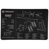 Introducing the TekMat Pistol Mat for Glock Gen 4 in sleek black, designed to offer superior firearm maintenance and care. This mat features a soft thermoplastic fiber surface that protects your firearm from grease and oil stains, while the neoprene rubber substrate provides padding to safeguard your gun and surfaces from dings and scratches. The integrated exploded parts diagram allows for easy disassembly and reassembly, enhancing your cleaning routine without the need for an owner's manual.